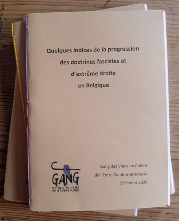 Afin de comprendre ce qui nous arrive, comment résister et ne pas perdre espoir, le Gang des Vieux en Colère de l’Entre-Sambre-et-Meuse a édité une petite brochure intitulée « Quelques indices de la progression des doctrines fascistes et d’extrême-droite en Belgique » que vous pourrez lire en suivant le lien ci-dessous ou en commandant une brochure imprimée et reliée à la main. Elle est le symbole de la patience et de l’attention nécessaires au tissage de liens contre l’avancée des dangers. Elle se veut un outil pour discuter et pour résister et a été élaborée à partir de l’étude des propositions de lois déposées par le gouvernement De Wever épaulé par le Vlaams Belang.