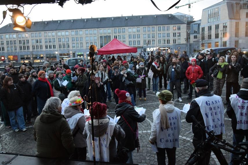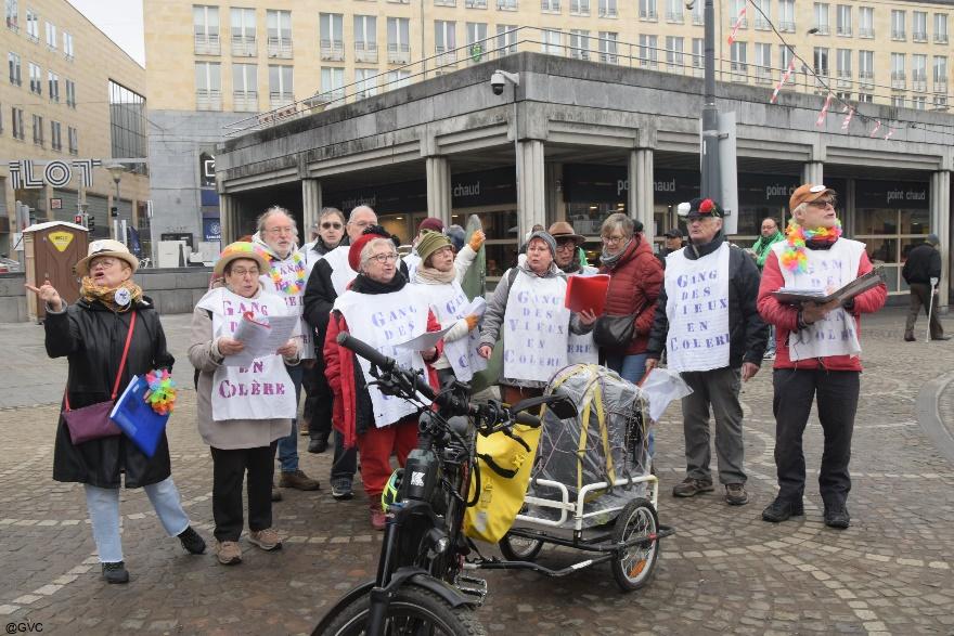 Eliane Rulmont, une des fondatrices de la régionale liégeoise du Gang des Vieux en Colère, a pris la parole à la tribune. Elle y a présenté un résumé des revendications du Gang. Toutes ces interventions favorisent une plus grande visibilité de notre collectif et assure un soutien indéfectible aux travailleurs·euses, pensionné·e·s, personnes sans emploi, malades de longue durée.